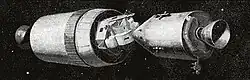 Le véhicule spatial Apollo (ou module de commande et de service, abrégé en CSM) transporte les astronautes à l'aller et au retour. Pesant plus de 30 tonnes, il est pratiquement dix fois plus lourd que le vaisseau Gemini. La masse supplémentaire (21,5 tonnes) est en grande partie représentée par le moteur et les ergols qui fournissent un delta-v de 2 800 m/s permettant au vaisseau de s'insérer en orbite lunaire puis de quitter cette orbite. Le vaisseau Apollo reprend une disposition inaugurée avec le vaisseau Gemini : un module de commande (CM) abrite l'équipage et un module de service (SM) contient le moteur de propulsion principal, l'essentiel des sources d'énergie ainsi que l'équipement nécessaire à la survie des astronautes. Le module de service est largué juste avant l'atterrissage[51].