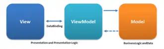 Apparu en 2004[3], MVVM est originaire de Microsoft et adapté pour le développement des applications basées sur les technologies Windows Presentation Foundation et Silverlight[4] via l'outil MVVM Light[5] par exemple. Cette méthode permet, tel le modèle MVC (modèle-vue-contrôleur), de séparer la vue de la logique et de l'accès aux données en accentuant les principes de liaison et d’événement.