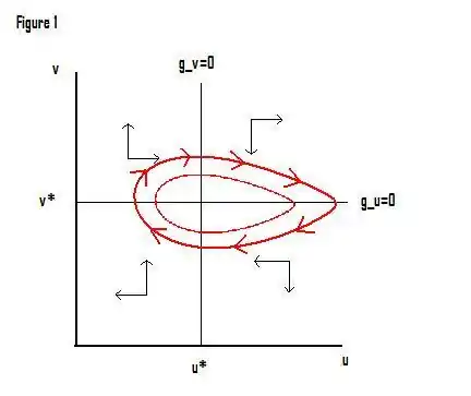 Bien que le modèle puisse être résolu explicitement, il est intéressant d'analyser la trajectoire de l'économie en termes de diagramme de phase. En définissant les deux équations ci-dessus égales à zéro, nous obtenons les valeurs de u et v pour lesquelles la croissance de v et la croissance u, respectivement, sont nulles.