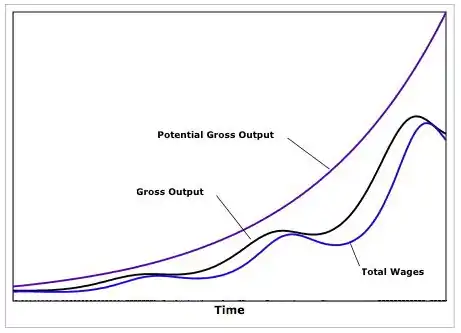 La figure ci-dessous illustre l'évolution de la production potentielle (production au plein emploi), de la production réelle et des salaires au fil du temps.