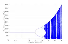 - pour , la population aura un comportement chaotique, avec des retours ponctuels à la périodicité.