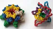 Il est également devenu possible récemment de créer des modèles moléculaires précis à l'intérieur de blocs de verre en utilisant une technique connue sous le nom de gravure laser souterraine. L'image de droite (Fig. 7) montre la structure 3D d'une protéine d' E. coli (sous-unité bêta de l'ADN polymérase, code PDB 1MMI) gravée à l'intérieur d'un bloc de verre par la société britannique Luminorum Ltd.