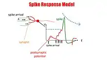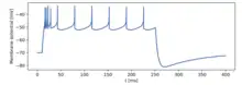 et converge pour des courants d'entrée grand vers le modèle sans fuite avec période réfractaire vue précédemment[2]. Ce modèle peut également être utilisé pour les neurones inhibiteurs[13],[14].