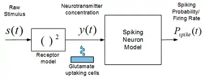 - Stimulation naturelle ou modèles de neurones d'entrée pharmacologiques - Les modèles de cette catégorie relient le stimulus d'entrée, qui peut être pharmacologique ou naturel, à la probabilité d'un événement d'impulsions. L'étage d'entrée de ces modèles n'est pas électrique, mais comporte soit des unités de concentration pharmacologiques (chimiques), soit des unités physiques qui caractérisent un stimulus externe tel que la lumière, le son ou d'autres formes de pression physique. De plus, l'étage de sortie représente la probabilité d'un déclenchement d'impulsion et non une tension électrique.