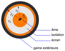 Pour les câbles, les calculs de résistance et d'inductivité sont identiques[14]. La capacité vaut :