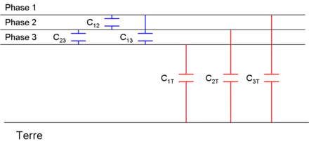 Dans un système triphasé, il y a des capacités entre les lignes et la terre, mais également entre lignes. L'objectif est de synthétiser le tout dans une seule capacité "moyenne" Cb égale pour les trois lignes :