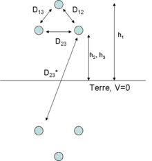 Afin de modéliser le potentiel nul de la terre, on utilise le principe des miroirs. C'est-à-dire qu'on modélise des conducteurs fictifs placés de manière symétrique à la terre par rapport aux conducteurs réels et chargés de manière opposée. La terre a alors un potentiel nul.
