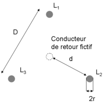 Pour un système triphasé on considère un conducteur de retour fictif situé entre les 3 phases. Les équations ci-dessus sont encore applicables, il faut de plus calculer les inductances mutuelles entre phases[8]. Attention les conducteurs sont simples ici, pour le détails avec des faisceaux de conducteur se référer à la note[7].