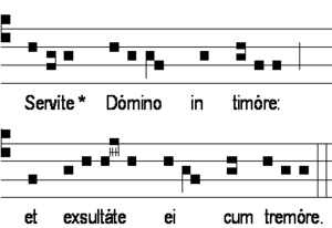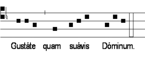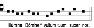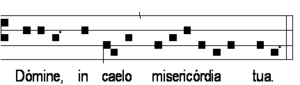 Cet exemple (Ps 8:2) est typique du premier mode : une superposition des teneurs A, C et B (formule ACB). L'intonation est typique de ce mode, ainsi que le phrasé qui retombe entre une teneur en la (premier et deuxième segment), puis en fa (troisième segment), pour revenir se poser sur le ré.