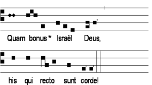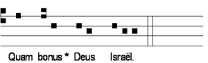 L'exemple ci-dessus est un mode mixte. Dans ces deux incises on y reconnaît bien finalement une base de type A sur la corde sol. Les initiales, en revanche, sont nettement posées sur le do, qui joue le rôle d'une corde modale de type C, mais la broderie au demi-ton inférieur est systématiquement évitée. Quand le si naturel finit par apparaître, sur « recto », il amorce la descente sur le sol, et appartient donc déjà à la teneur A inférieure. La « version courte » de l'antienne (Ps 72:1a) suit la même structure, de manière encore plus simple :