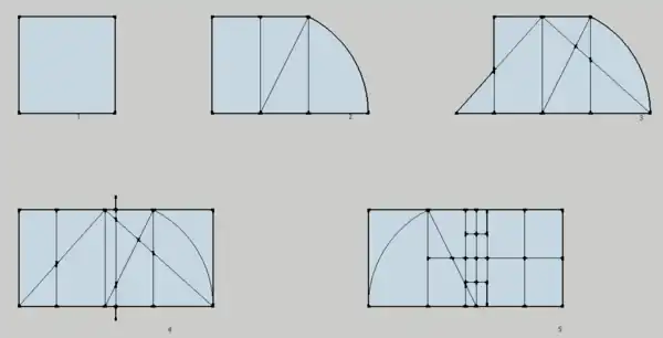- Une dernière étape consiste à tracer une symétrie du plus petit rectangle appartenant au système et en traçant une médiane dans le sens de la longueur (5).