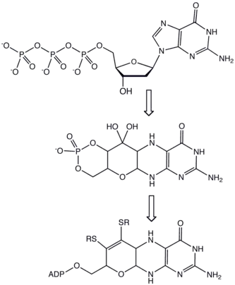 La molybdoptérine elle-même ne contient pas de molybdène et n'est pas un cofacteur enzymatique, mais donne le cofacteur à molybdène par fixation, après élimination d'une molécule d'eau, d'un ligand trioxyde de molybdène sous forme MoO22+ sur les groupes sulfhydryle.