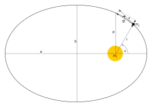 décrit le mouvement. est le paramètre gravitationnel standard et (valeur absolue ) est le vecteur de distance qui pointe depuis le corps central au satellite parce que la masse du satellite est négligeable[Notes 1].
