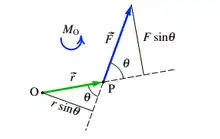 Par définition, la norme MO du moment par rapport à un point O d'une force appliquée en un point P est proportionnelle à cette composante F · sin θ et à la distance OP. De manière équivalente, le moment est égal à l'intensité de la force, multipliée par le bras de levier de son point d'application, c'est-à-dire la distance entre le point O et la droite passant par P et de direction , laquelle vaut d = r · sin θ :