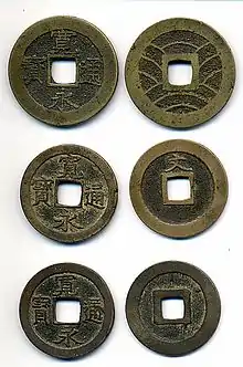 La monnaie de bronze valant 100 mon possédait une forme elliptique et pesait un peu plus de 20 g ; les plus courantes furent frappées sous l'ère Tenpō (1830-1844).