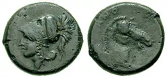 - Les monnaies du type Mars présentent sur le droit la tête de la divinité barbue et casquée et sur le revers une tête de cheval avec harnais positionné sur un dauphin nageur.