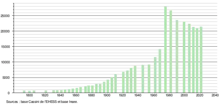 L'évolution du nombre d'habitants est connue à travers les recensements de la population effectués dans la commune depuis 1793. Pour les communes de plus de 10 000 habitants les recensements ont lieu chaque année à la suite d'une enquête par sondage auprès d'un échantillon d'adresses représentant 8 % de leurs logements, contrairement aux autres communes qui ont un recensement réel tous les cinq ans[39],[Note 3].