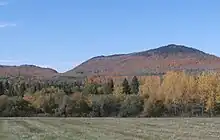 Vue du mont Scotch depuis le rang Dubrule, à Saint-Augustin-de-Woburn ; la route 212 passe dans le col (598 m) au centre-gauche.