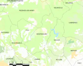 - Le village de Montesquieu est en ruines. La commune comprend plusieurs hameaux : Le Mas Rolland où se trouvent la mairie et l'ancienne école; Paders, près de la vallée de la Peyne, affluent de l'Hérault; Fournols, dans le nord du territoire communal; Valuzières, hameau situé sur le versant méridional.