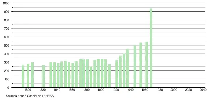 - Par convention dans Wikipédia, le principe a été retenu de n’afficher dans le tableau des recensements et le graphique, pour les populations légales postérieures à 1999, que les populations correspondant à une enquête exhaustive de recensement pour les communes de moins de 10 000 habitants, et que les populations des années 2006, 2011, 2016, etc. pour les communes de plus de 10 000 habitants, ainsi que la dernière population légale publiée par l’Insee pour l'ensemble des communes.