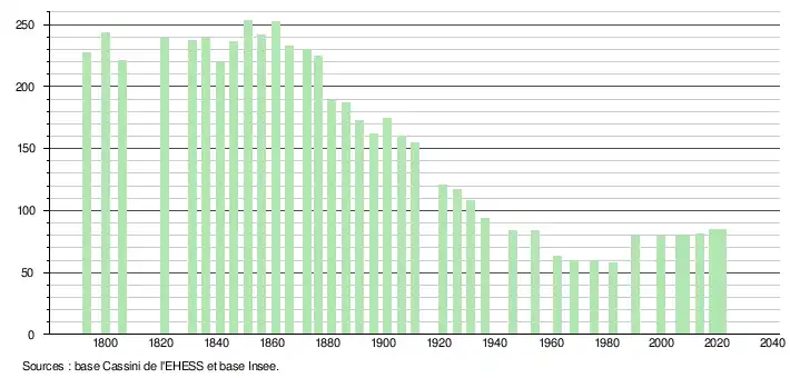 L'évolution du nombre d'habitants est connue à travers les recensements de la population effectués dans la commune depuis 1793. Pour les communes de moins de 10 000 habitants, une enquête de recensement portant sur toute la population est réalisée tous les cinq ans, les populations légales des années intermédiaires étant quant à elles estimées par interpolation ou extrapolation[20]. Pour la commune, le premier recensement exhaustif entrant dans le cadre du nouveau dispositif a été réalisé en 2008[21].