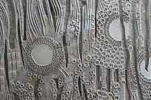 - L'escalier principal de la bibliothèque François Villon, 81 boulevard de la Villette, à Paris, est embelli par une fresque en béton de Morog.