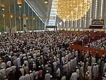 La salle principale affiche une superficie de 5 000 mètres carrés pouvant accueillir 10 000 fidèles et son plafond s'élève à 44 mètres[6]. Elle est recouverte de marbre blanc décoré de mosaïques dessinées par le peintre pakistanais Sadequain et orné d'un grand chandelier turc. Jouxtant sa façade orientale, la mosquée dispose en sus de vastes annexes dans son hall principal pouvant abriter 24 000 personnes supplémentaires. Avec la cour et les jardins, la capacité totale du site monte à 74 000 personnes[4].