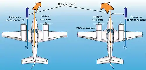 Il importe de rappeler que cet exemple s’applique aux moteurs dont l’hélice tourne en sens horaire (sens des aiguilles d'une montre). Sur les avions dont les hélices tournent en sens anti-horaire (inverse des aiguilles d’une montre) le moteur critique est le moteur droit.