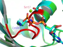 Outre la lysine, le motif A de Walker utilise également les quatre résidus Xaa–Xaa–Gly–Lys pour former une cavité de la taille d'un groupe phosphate avec les groupes –NH– pointant vers l'intérieur[5]. On a pu montrer que l'hexapeptide Ser–Gly–Ala–Gly–Lys–Thr est capable de se lier fortement au phosphate inorganique[6], ce qui indique que c'est la cavité, davantage que l'extrémité N-terminale d'une hélice α, qui assure la liaison au groupe phosphate.