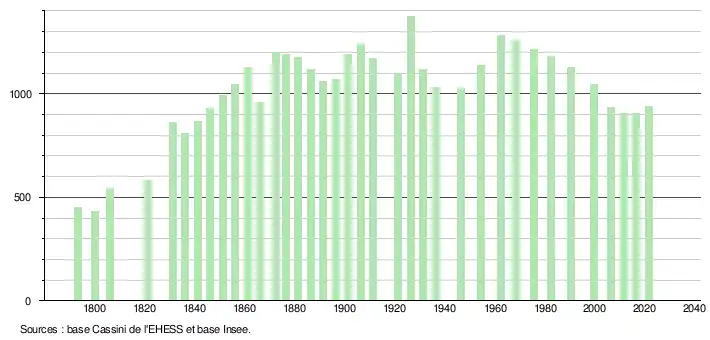 L'évolution du nombre d'habitants est connue à travers les recensements de la population effectués dans la commune depuis 1793. Pour les communes de moins de 10 000 habitants, une enquête de recensement portant sur toute la population est réalisée tous les cinq ans, les populations légales des années intermédiaires étant quant à elles estimées par interpolation ou extrapolation[24]. Pour la commune, le premier recensement exhaustif entrant dans le cadre du nouveau dispositif a été réalisé en 2006[25].