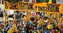 Depuis 2014, des portions croissantes du mouvement climatique, en particulier aux États-Unis, s'organisent pour une réponse économique internationale au changement climatique à l'échelle de la mobilisation du front intérieur américain pendant la Seconde Guerre mondiale, dans le but de réduire rapidement les émissions de carbone et de passer à une énergie 100 % propre plus rapidement que le marché libre ne le permet probablement. Tout au long de 2015 et 2016, The Climate Mobilization a mené des campagnes populaires aux États-Unis pour cette échelle d'ambition, et en juillet 2016, des militants ont réussi à faire adopter un texte dans la plate-forme nationale du Parti démocrate appelant à une mobilisation climatique à l'échelle de la Seconde Guerre mondiale[73]. En août 2015, l'écologiste Bill McKibben a publié un article dans le New Republic ralliant les Américains à « déclarer la guerre au changement climatique »[74].