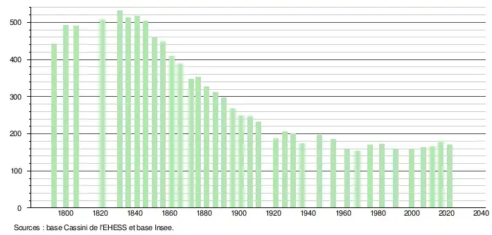 L'évolution du nombre d'habitants est connue à travers les recensements de la population effectués dans la commune depuis 1793. Pour les communes de moins de 10 000 habitants, une enquête de recensement portant sur toute la population est réalisée tous les cinq ans, les populations légales des années intermédiaires étant quant à elles estimées par interpolation ou extrapolation[27]. Pour la commune, le premier recensement exhaustif entrant dans le cadre du nouveau dispositif a été réalisé en 2006[28].