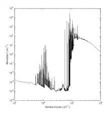 - le second terme correspond à l'émission du milieu. Lorsque ce terme tend vers zéro et la solution du problème vers . Il fait apparaître l'absorbance spectrale