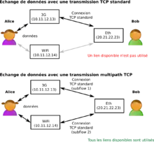Dans une application TCP standard, la connexion doit être établie entre deux adresses IP (TCP définit la source et la destination comme des tuples adresse IP, port). Il n'est donc possible d'utiliser qu'un seul lien. Une application multipath TCP peut tirer profit de l'utilisation des chemins différents (un chemin, aussi appelé sub-flow est une connexion TCP standard entre deux interfaces) pour parler d'Alice à Bob.
