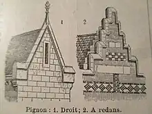Le pignon non couvert peut être à redents : l'arase (sommet de mur) forme des marches qui sont un élément du style de façade et parfois un passage par l'extérieur à une flèche.