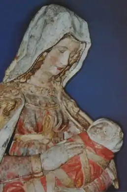 - Parmi la statuaire, on peut voir La Tentation d'Ève (XIIe siècle), attribuée à Gislebert[7],[8]. Ce haut-relief figurait sur le linteau d'un portail latéral de la cathédrale Saint-Lazare d'Autun. Le Tombeau de saint Lazare (vers 1170), œuvre monumentale signée du moine Martin[9], est en partie reconstitué à l'aide des statues préservées : Saint André, Marthe et Marie-Madeleine. Ce reliquaire de six mètres de haut, en forme d'église miniature, se trouvait derrière le chœur de la cathédrale d'Autun et fut détruit en 1766[10],[11]. Par ailleurs, sont aussi présentées des sculptures réalisées par des artistes bourguignons du XVe siècle et représentant, entre autres, Sainte Marguerite, Saint Michel, Sainte Catherine et Sainte Barbe. Enfin, la Vierge d'Autun, en calcaire polychrome, est un des chefs-d'œuvre du musée.