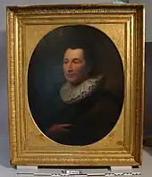 - Jean-Alexis Grimou (Argenteuil (?), 1678 (?)-Paris, 1733)[4] : Portrait d'homme avec une collerette, première moitié du XVIIIe siècle. Ce portrait entré dans les collections en 1986 faisait partie de la collection Galloys vendu le . Il est décrit dans le Catalogue des tableaux trouvés après le décès de Madame Galloys […][5] sous le numéro 36 : « Un tableau peint sur toile par Jean Grimou, représentant un homme enveloppé dans son manteau, le tenant d'une main, fraise au col, nue tête, de deux pieds & demi de haut sur deux pieds de large, dans sa bordure de bois doré & sculpté très-riche. »