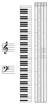 Les notes de l'échelle chromatique sont représentées par un nombre entier codé sur 7 bits[12], ce qui permet de couvrir plus de 10 octaves : du C-1[N 1] (note 0) au G9[N 2] (note 127) par pas d'un demi-ton. Les hauteurs intermédiaires entre les notes peuvent être atteintes au moyen du message pitch-bend.