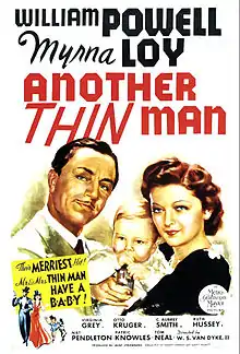 Myrna Loy est engagée dans le rôle de Nora Charles dans L'Introuvable — titre original The Thin Man, d'après un roman de Dashiell Hammett — toujours en 1934. Le réalisateur W. S. Van Dyke la retient après avoir remarqué en elle un sens de l'humour que ses films précédents n'avaient pas révélé. Lors d'une réception à Hollywood, il la pousse dans une piscine pour tester sa réaction et est surpris de sa réaction plutôt joyeuse. Il estime qu'elle possède exactement les qualités nécessaires pour le rôle[44] malgré les réticences de Louis B. Mayer qui ne voit en elle qu'une actrice orientée vers des rôles dramatiques[45]. Le film est un succès immense au box-office d’Hollywood, et fut nommé pour l'Oscar du meilleur film. La série des Thin Man donne lieu à cinq autres films avec les deux acteurs. La critique loue le talent de Myrna Loy dans le registre de la comédie. Elle déclare : « Ce film m'a apporté la consécration après avoir joué dans 80 films !»[46]. Elle et son partenaire William Powell forment un des couples les plus populaires à l’écran et apparaissent ensemble dans quatorze films. Leur complicité à l'écran est tel que le public croit qu'ils sont réellement mariés[47]. Se liant d'amitié avec l'acteur, elle dira à son propos : « Nous nous ressemblions trop pour avoir une quelconque romance ensemble !»[48]. Le duo se reforme dans Le Témoin imprévu dans un registre dramatique. Elle enchaîne ensuite avec La Course de Broadway Bill, toujours la même année, de Frank Capra. Avec L'Espionne Fräulein Doktor, elle interprète pour la dernière fois un rôle d'espionne et de séductrice, inspiré de Mata Hari[49],[50]. Dès lors, elle acquiert une notoriété grâce à son statut d'épouse idéale de Hollywood. Dans la foulée, elle refuse un projet de Louis B. Mayer : New York-Miami aux côtés de Clark Gable[51].