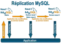MySQL est capable, depuis la version 3.23.15 d'utiliser un système de réplication à sens unique relativement simple à mettre en place : un serveur maître qui contient la base de données source et va recevoir l'ensemble des modifications, et un serveur esclave qui contient une base à structure identique et qui va se connecter au serveur maître pour aller chercher les nouvelles modifications et mettre à jour ses bases. Un maître peut avoir plusieurs esclaves, et un esclave peut devenir à son tour maître pour un autre serveur esclave, réalisant ainsi une chaîne de réplication[21].
