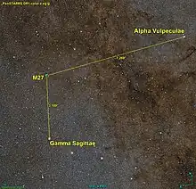 La nébuleuse M27 est située à environ 7,3 degrés au sud-est d'Alpha Vulpeculae et à 3,2 degrés au nord de Gamma Sagittae.