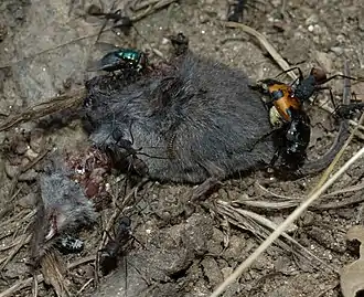 Les nécrophores (genre Nicrophorus) regroupent des insectes dits « nécrophages », c'est-à-dire qui se nourrissent de cadavres. Ils enterrent les carcasses de petits vertébrés comme les oiseaux et les rongeurs, et s'en servent de source de nourriture pour leurs larves.