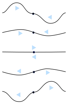 - Limite fixe : des exemples de ce type de limite sont le point d'attache d'une corde de guitare, l'extrémité fermée d'un tuyau ouvert comme un tuyau d'orgue ou un tube d'instruments de la famille des bois, la périphérie d'une peau de tambour, une ligne de transmission dont l'extrémité est court-circuitée, ou les miroirs aux extrémités d'une cavité laser. Dans ce type, l'amplitude de l'onde est forcée à zéro à la frontière, il y a donc un nœud à la frontière et les autres nœuds se trouvent à des multiples d'une demi-longueur d'onde de celle-ci:0, λ/2, λ, 3λ/2, 2λ, ..., n.λ/2