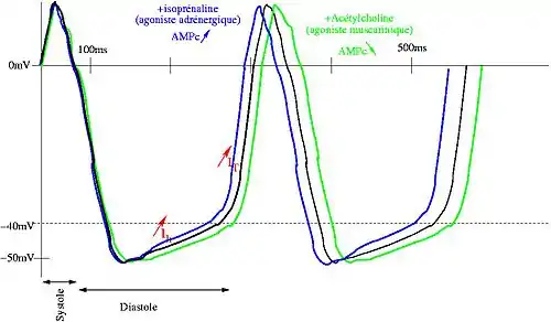 - le nerf vague dont la stimulation provoque un ralentissement de la fréquence cardiaque, en libérant de l'acétylcholine, qui, via l'activation de récepteur muscarinique, diminue la concentration en AMPc, ce qui ralentit la cinétique du courant Ih , et donc allonge la période de dépolarisation diastolique et diminue la fréquence cardiaque.