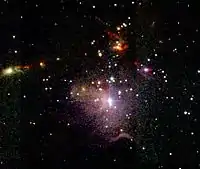 La nébuleuse par réflexion NGC 2071. Trois autres nébuleuse (NGC 2067, NGC 2067 et M78 (NGC 2068)) sont situées dans la même région et leurs positions sont quelquefois confondues. | |