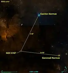 NGC 6167 est situé à environ 2,4 degrés au nord-est de l'étoile Gamma2 Normae et à 2,6 degrés au sud-est de Epsilon Normae (en).