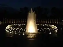 Le ton gris clair, la monumentalité abstraite du monument lui donnent un caractère discret et émouvant, bien que solennel. Un escalier en pente douce mène à la fontaine depuis la 17e rue Ouest. Sur les murs de cet accès, des panneaux sculptés avec réalisme par Ray Kaskey décrivent des scènes banales de guerre, en haut-relief. Un mur porte 4000 étoiles, hommage aux combattants qui furent tués.
