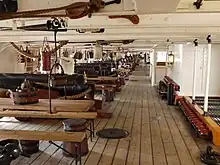 Les premiers cuirassés britanniques, français et russes adoptèrent logiquement le dessin des navires de ligne utilisés lors des siècles précédents dont les canons étaient situés en bordées sur les flancs[36],[37]. La Gloire française et le HMS Warrior britannique sont deux exemples de ce type. Du fait du poids de leur blindage, ils ne pouvaient disposer que d'une seule ligne de canons sur le pont principal plutôt que sur plusieurs ponts[14].