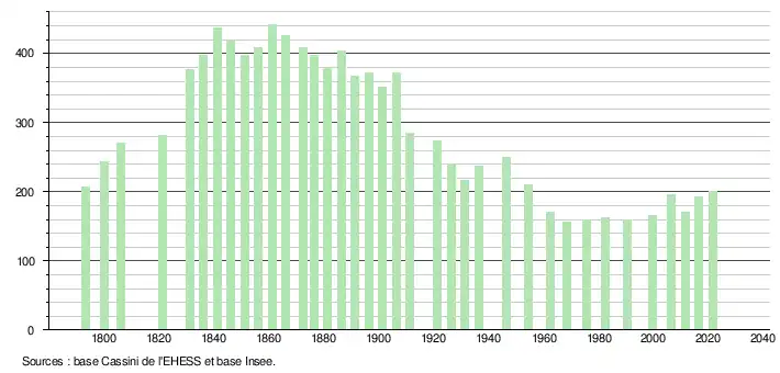 L'évolution du nombre d'habitants est connue à travers les recensements de la population effectués dans la commune depuis 1793. Pour les communes de moins de 10 000 habitants, une enquête de recensement portant sur toute la population est réalisée tous les cinq ans, les populations légales des années intermédiaires étant quant à elles estimées par interpolation ou extrapolation[39]. Pour la commune, le premier recensement exhaustif entrant dans le cadre du nouveau dispositif a été réalisé en 2006[40].