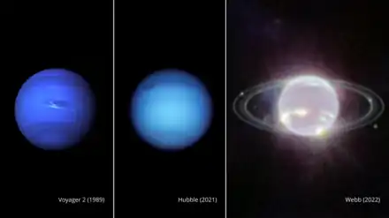 La distance de la planète à la Terre lui donnant une très faible taille apparente, son étude est difficile avec des télescopes situés sur la Terre. Neptune est visitée une seule fois lors de la mission Voyager 2, qui en réalise un survol le . L'avènement du télescope spatial Hubble et des grands télescopes au sol à optique adaptative a ensuite permis des observations détaillées supplémentaires.